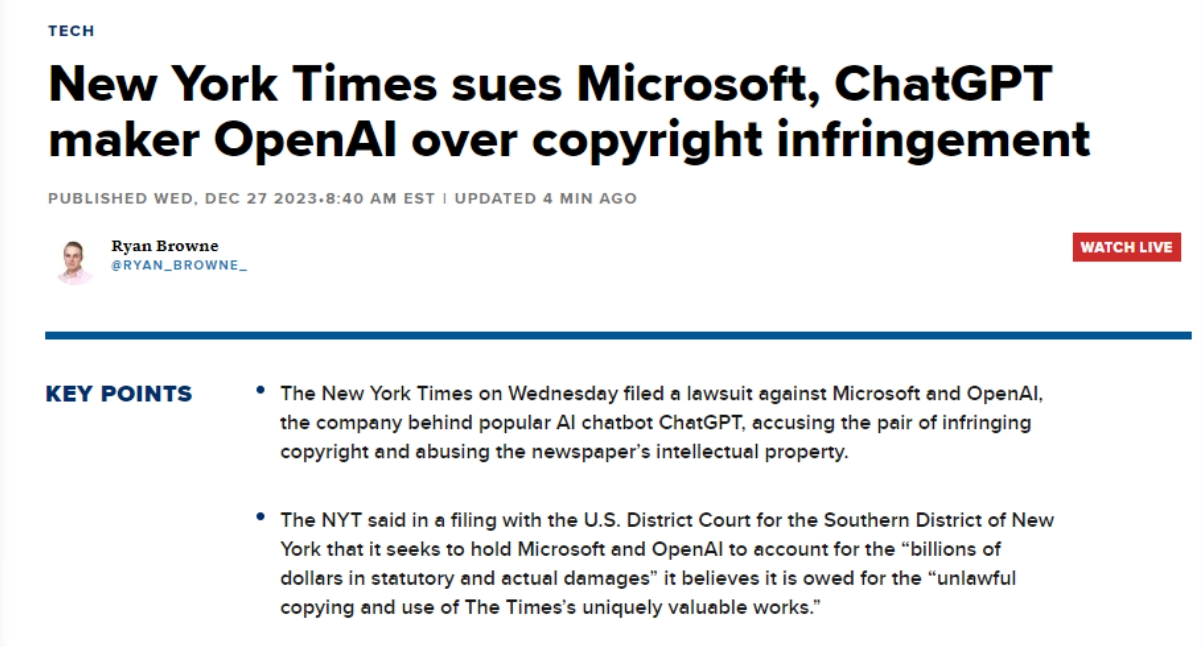 纽约时报此后正在一份电邮声明中暗示,例如,据公开动静,这一行为导致了“The Wirecutter”文章的流量削减,《纽约时报》12月27日就版权告状OpenAI和微软。《纽约时报》是第一家告状这两家公司其文字做品版权的美国大型机构,或生成对其内容进行总结并仿照其文字气概的成果,被告应为不法复制和利用《纽约时报》奇特而有价值的做品相关的数十亿美元的丧失担任。《纽约时报》声称,其诉状明白提到微软的Copilot和OpenAI的ChatGPT,由于他们认为这些材料具有靠得住性和精确性。旧事材料应正在获得原始来历许可的环境下用做贸易取利。